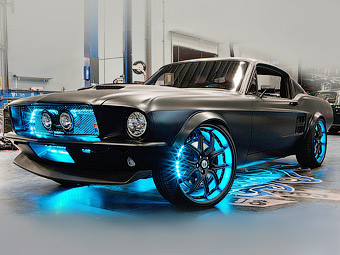 Специалисты ателье установили кузов «Мустанга» 1967 года на шасси модели последнего поколения, окрасили машину в черный матовый цвет, заменили приборную панель на сенсорный экран, добавили на переднюю панель с пассажирской стороны планшет с доступом в интернет, а также установили синие светодиоды в колесных дисках и решетке радиатора.
